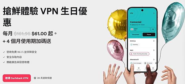 - 不過您還是可以透過 Surfshark 網站訂閱方案享受 30 天退款保證,等於變相免費用一個月