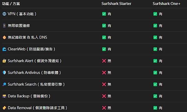 Surfshark Starter vs Surfshark One+ 完整比較表(2025最新)