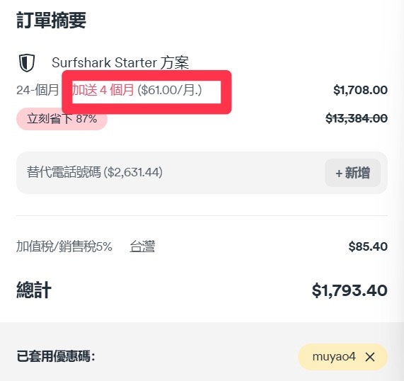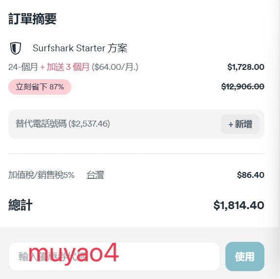 進入 Surfshark 官網,選擇方案後,在結帳頁輸入優惠券代碼【muyao4】,即可享最大折扣+額外四個月免費