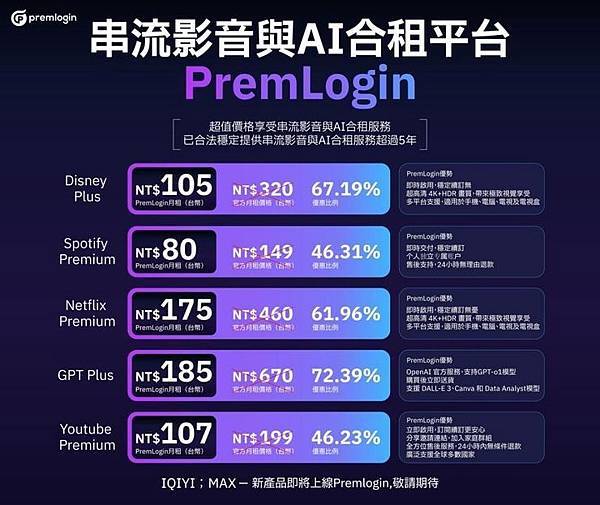 Premlogin 是一個提供「正版訂閱服務共享」的國際平台,主打「安全、穩定、省錢」三大特色。使用者可以用不到原價一半的價格,合法享有 ChatGPT、Netflix 4k、YouTube Premium、Disney+、Canva Pro、Spotify、PREPLEXITY PRO、CapCut Pro、Super Grok、Tinder、GAMMA PRO、Adobe、MAX、DUOLINGO SUPER、Notion、CRUNCHYROLL MEGA FAN、Office365、Readwise、Cookidoo、ENVATO、TIDAL、FIGMA、Downie 4、QUIZLET PLUS、CONSENSUS、Suno、STRAVA、League Pass、Bumble 等熱門付費服務。